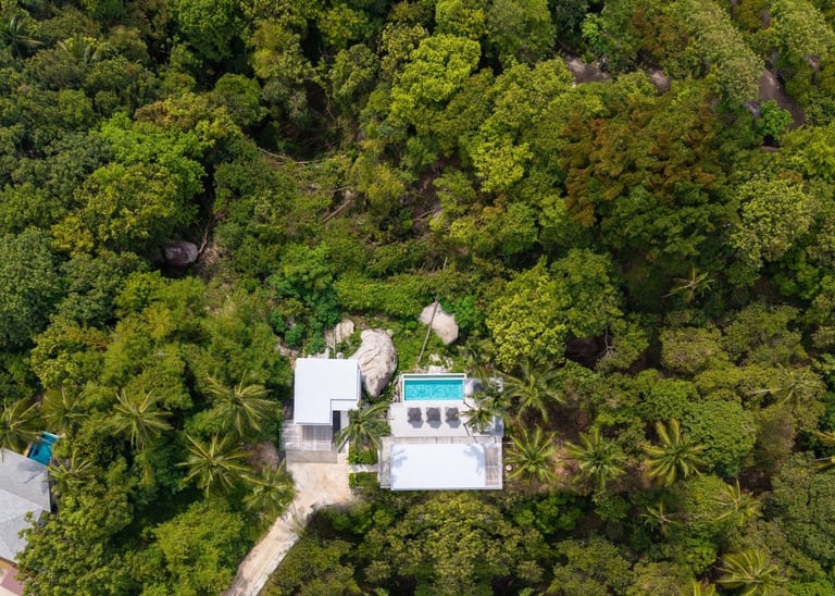 Nestled among tropical greenery and oversized boulders unique to Koh Phangan, the villa’s design blends nature and modern luxury to create a sanctuary unlike any other.